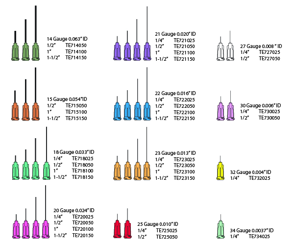 2. 21 Gauge 0.020†ID- 1/4†TE721025, 1/2†TE721050, 1†TE721100, 1-1/2†TE721150.