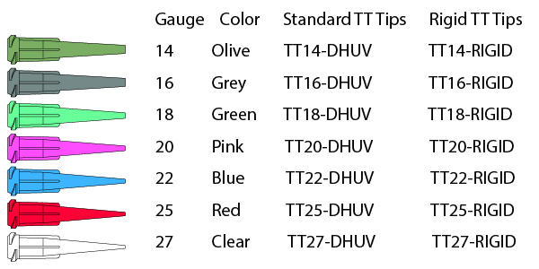 - Guage 18, Color- Green, Standard TT Tips- TT18-DHUV, Rigid TT Tips- TT18-RIGID.
