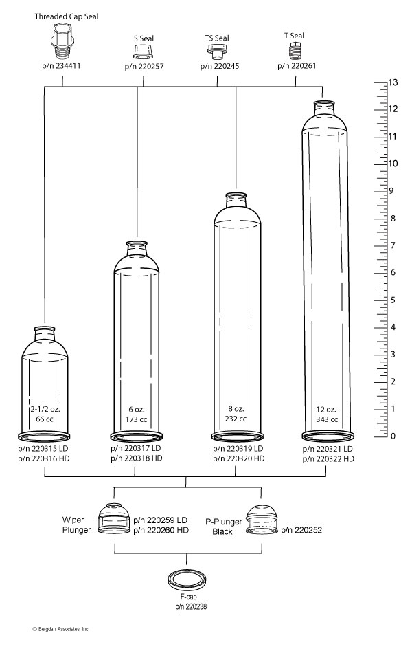Disposable plastic cartridges are available in 1, 2-1/2, 6, 8, 12, 20, 32 oz., and 1/10 gallon capacities for use with Semco ® dispensing guns. In addition, cartridges are available in low or high-density natural polyethylene and special order colors. All sizes are designed to accept 1 /4 NPT fittings.